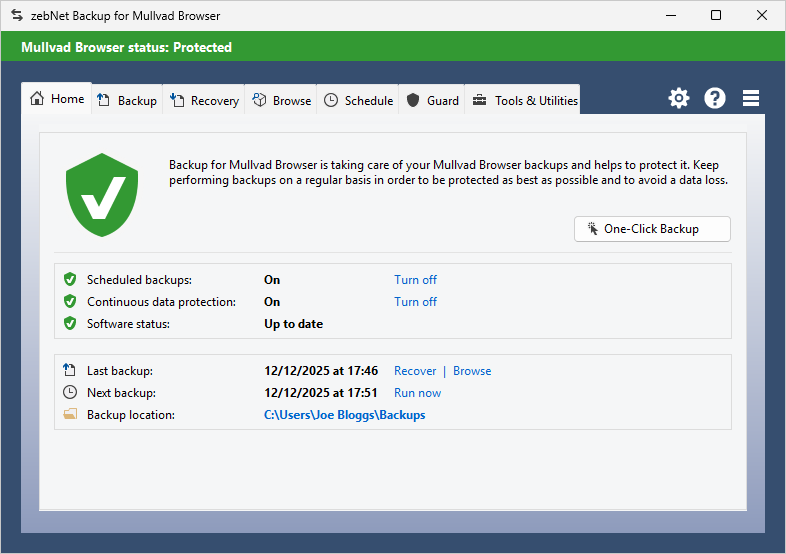 zebNet Backup for Mullvad Browser Free Edition is a free backup & recovery solution with basic features especially designed for Mullvad Browser.