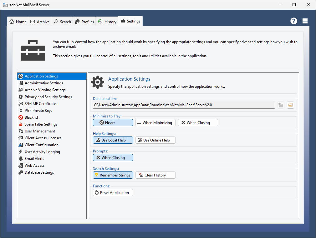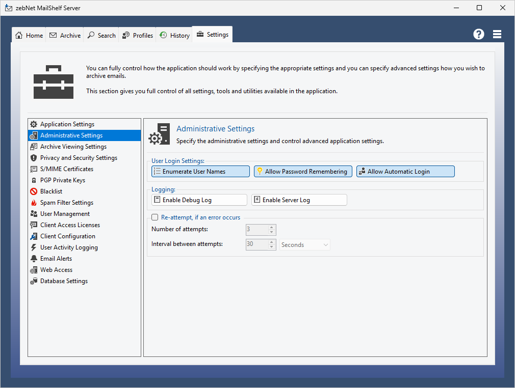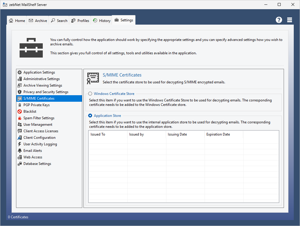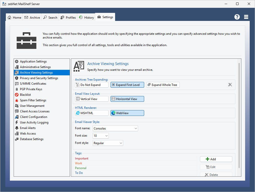 Have a look at the screenshots to get a first impression of what working with zebNet MailShelf Server looks like. Each image is only a thumbnail and you can click on an image to enlarge it.